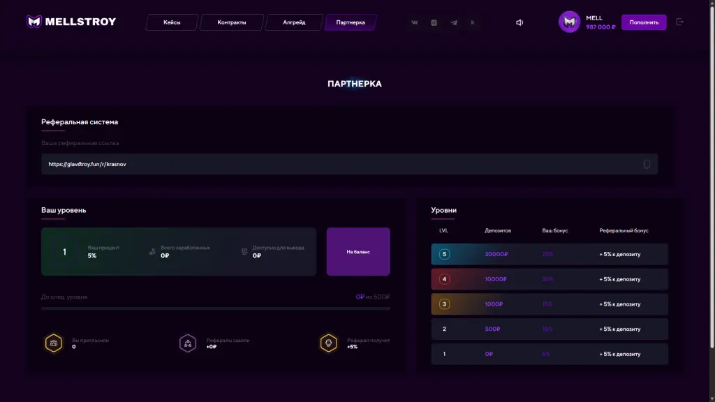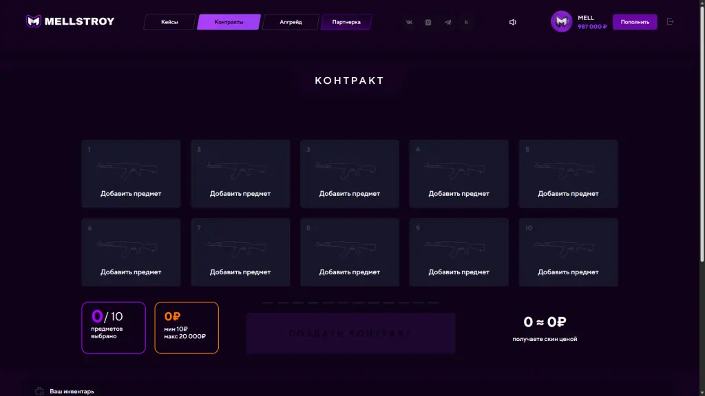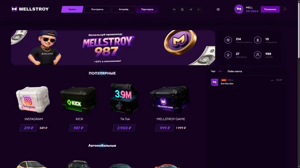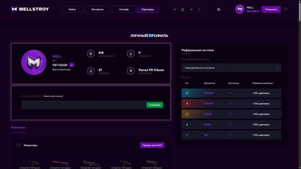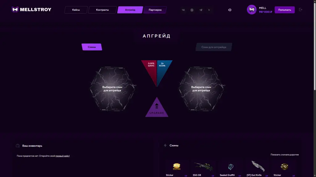 Полностью рабочая платформа с кейсами, апгрейдами, контрактами, профилями и системой пополнений. Реалистичный интерфейс, стабильная работа и полный функционал как у настоящего кейс-сайта.