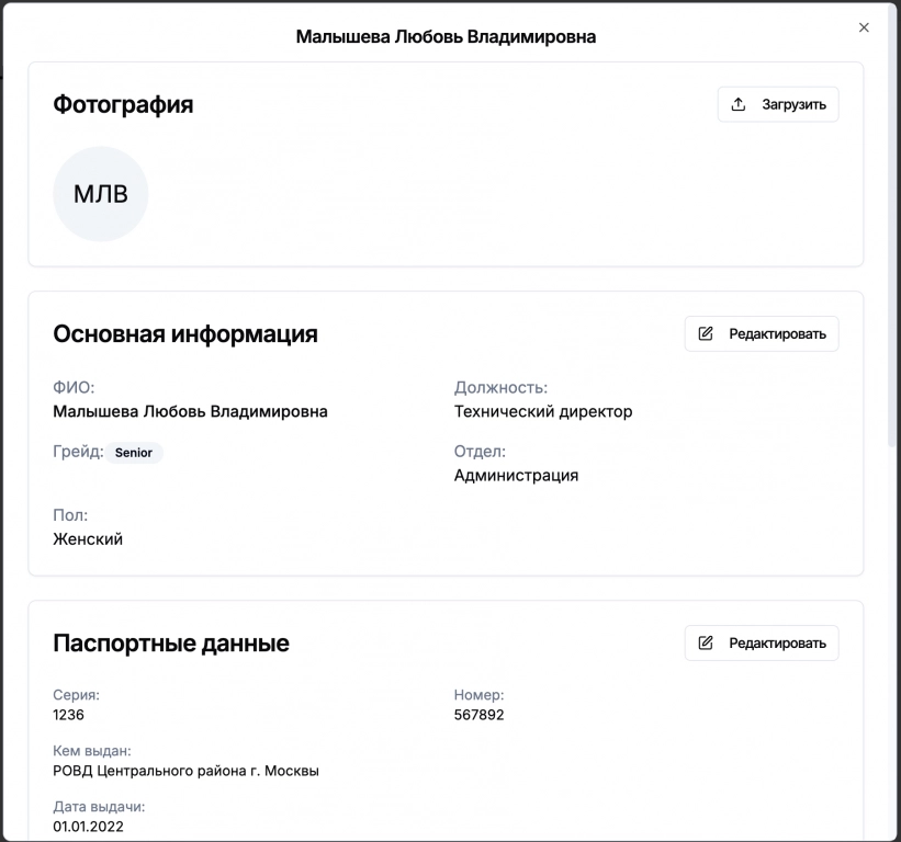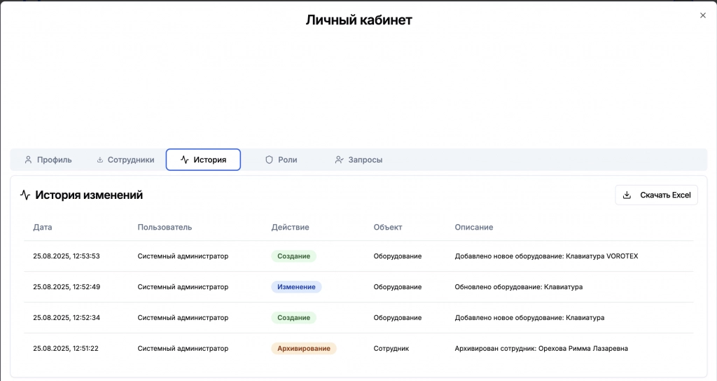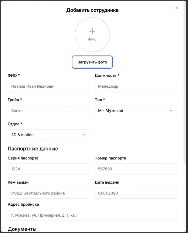 Возможность добавлять сотрудников вручную (по одному), но и с помощью шаблона в формате Excel;