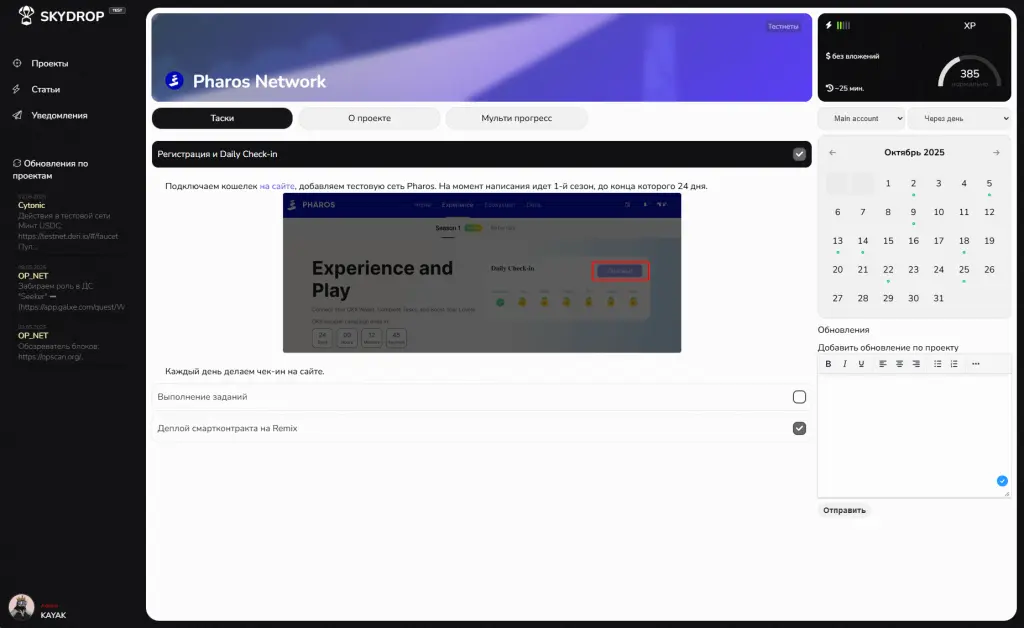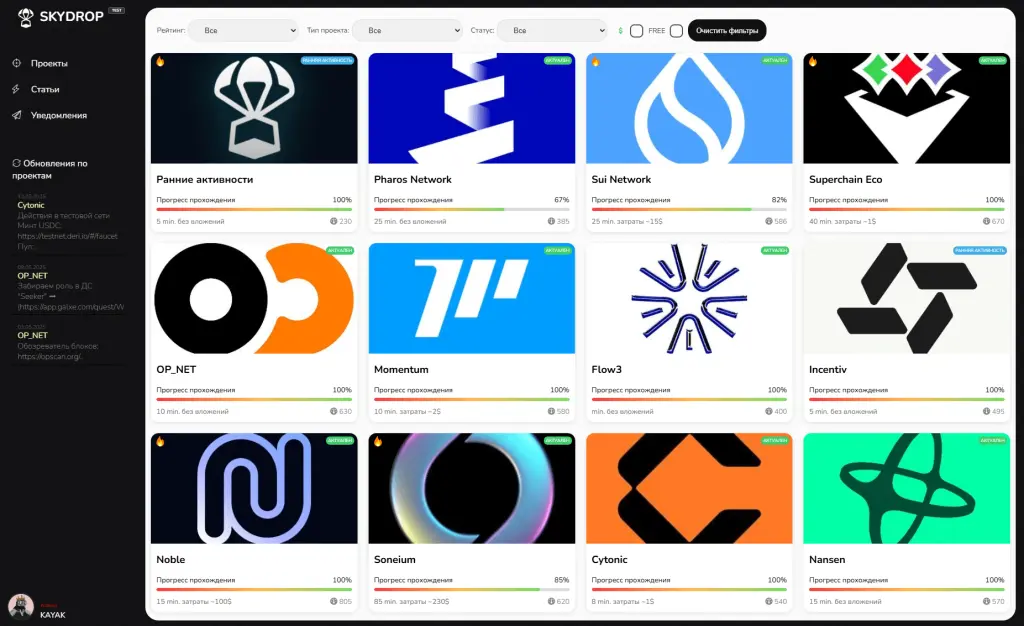 Устали от хаоса в поиске перспективных криптовалютных дропов? Skydrop — это мощный агрегатор, который систематизирует весь процесс участия в крипто-раздачах. Нашей платформой пользуются как новички, так и опытные фермеры. Мы предоставляем расширенные инструменты для фильтрации проектов по множеству параметров: от суммы потенциального вознаграждения и уровня сложности до репутации создателей. После выбора дропа вы получаете четкий план задач для выполнения, отмечаете их статус прямо в системе, а встроенный календарь поможет не упустить дедлайны и ключевые даты.